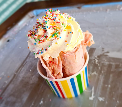 Wij hebben een mobiele teppanyaki plaat die koelt tot -30 graden celsius. Op deze plaat mixen wij een ijsbasis met bijvoorbeeld vers fruit of een koekje. Dit mengen wij met behulp van 2 spatels tot een luchtig geheel, welke wij vervolgens uitsmeren om het tot slot op te rollen tot het eindproduct: Ambachtelijke ijsrollen, afgemaakt met slagroom en een topping.